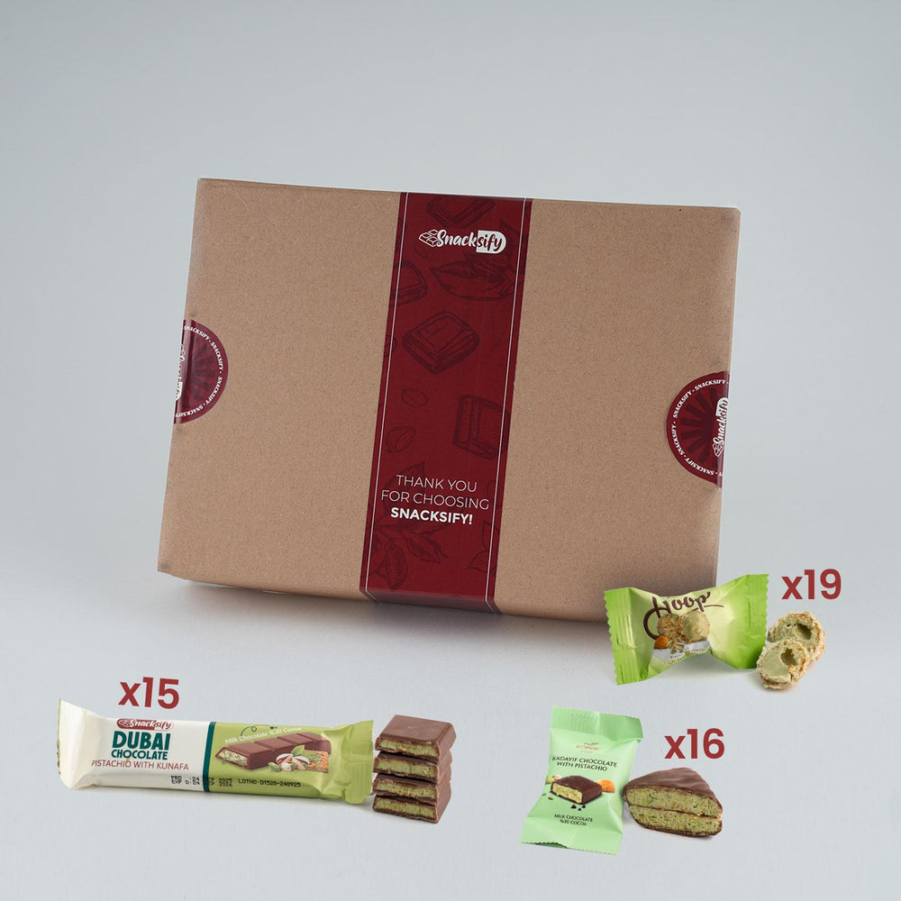 - Premium Assorted Gift Box: Includes 15 Mini Dubai Chocolate Bars (27g each), 16 Dubai Candies (13g each), and 19 Pistachio Balls – a luxurious assortment of Turkish-inspired sweets.